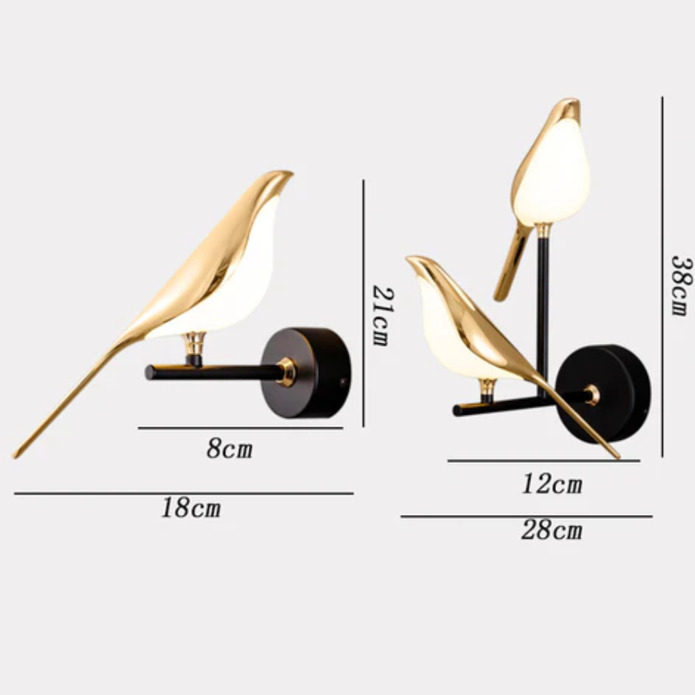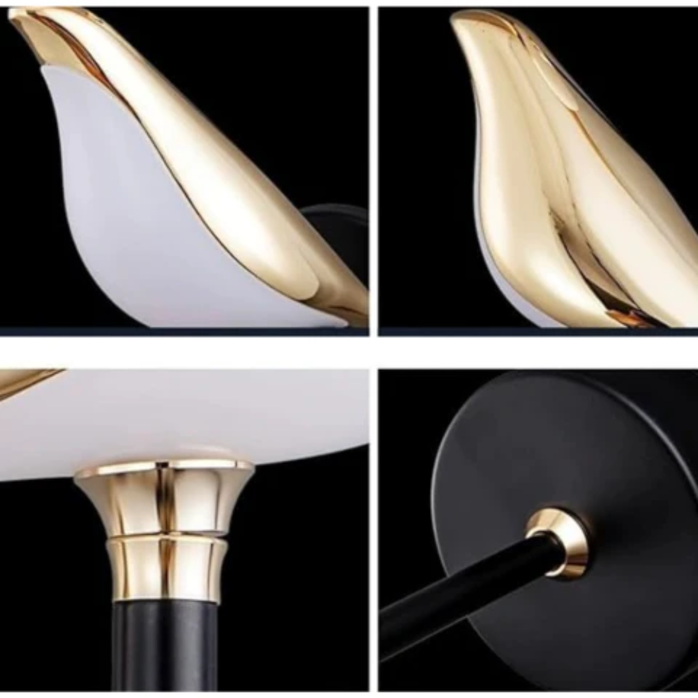 Applique murale au design oiseau avec corps doré et diffuseur blanc, montée sur une base ronde noire et un bras discret. Sa forme élancée apporte une lumière d’ambiance douce et décorative, idéale près d’un lit, dans un salon ou un couloir, tout en servant de pièce murale contemporaine.
