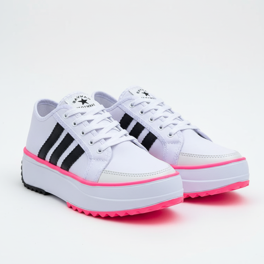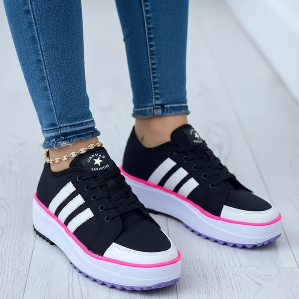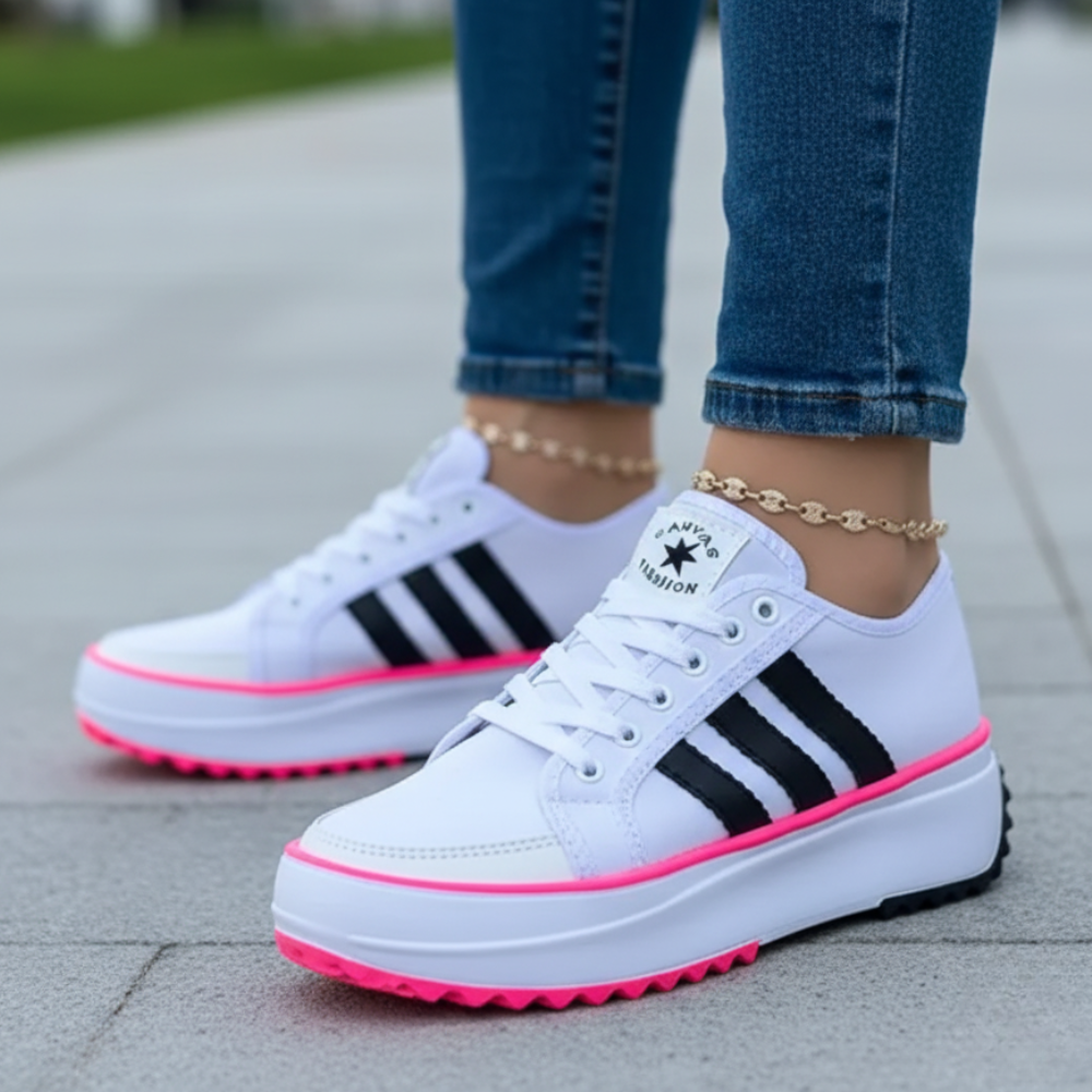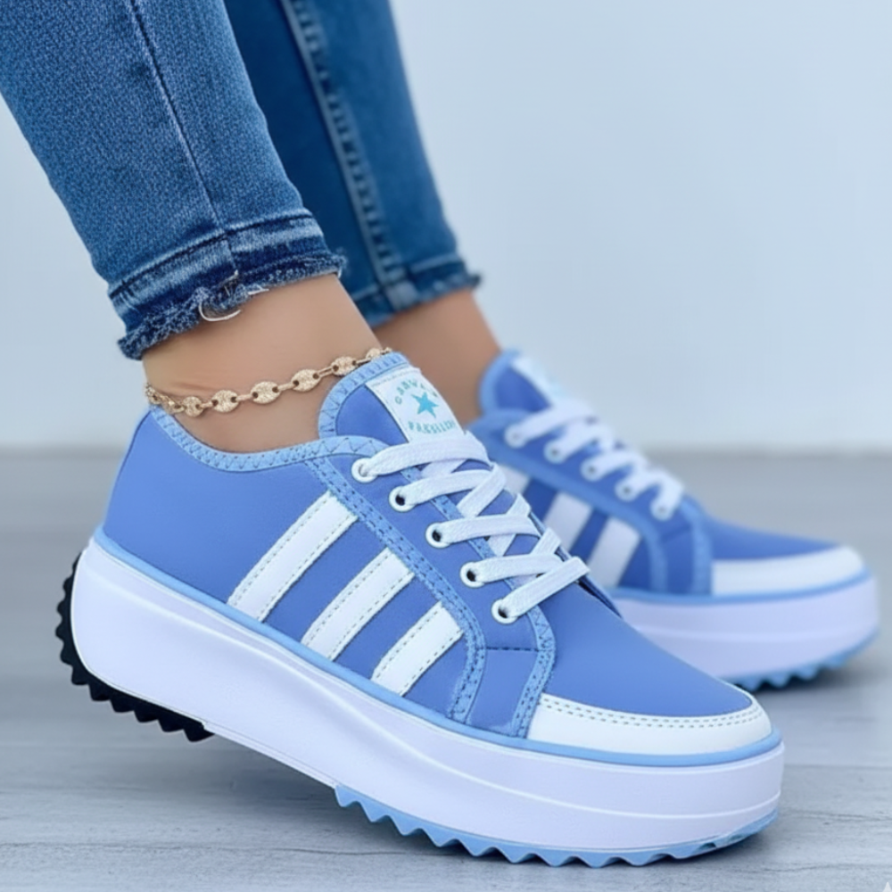 Baskets basses à plateforme avec lacets, dotées d’une semelle épaisse blanche et d’un dessous cranté pour une meilleure accroche. Leur tige lisse avec bandes latérales contrastées apporte un style sportif facile à porter au quotidien, tout en offrant un bon maintien et un confort stable grâce à la hauteur compensée.