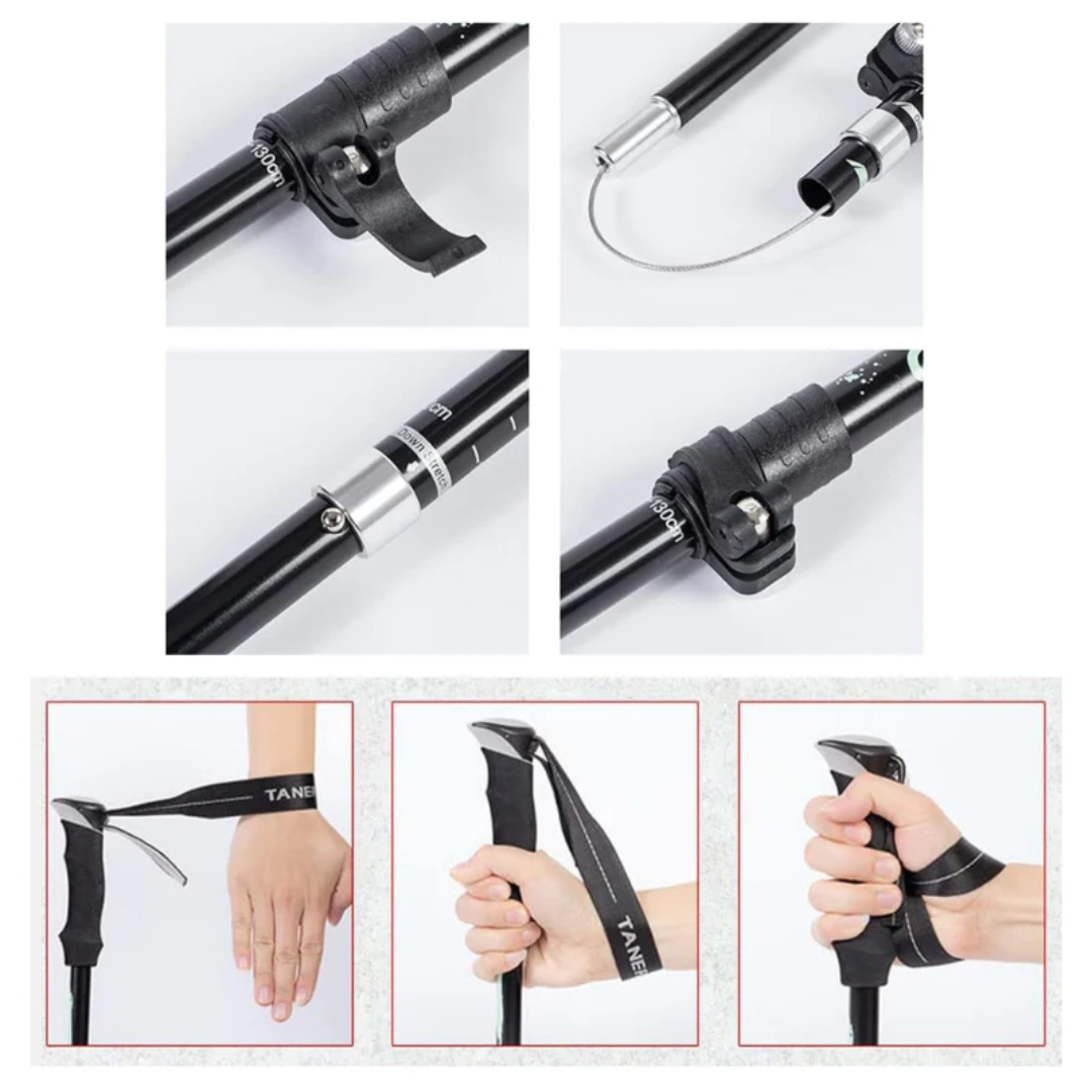 Paire de bâtons de randonnée conçus pour accompagner la marche, la randonnée et les activités de plein air. Leur structure télescopique permet un réglage simple de la longueur selon la taille et le terrain, tandis que les poignées ergonomiques avec dragonnes assurent une prise en main stable et confortable. Adaptés à différents usages, ils offrent un bon soutien lors des déplacements sur terrains variés.