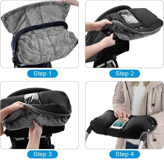 Ces chauffe-mains pour poussette se fixent directement sur le guidon : vous glissez vos mains dedans en 1 seconde, tout en restant au chaud et au sec pendant toute la promenade.