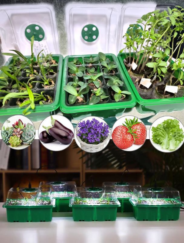 Cette mini serre de semis permet de faire germer et pousser de jeunes plantes à l’intérieur dans des conditions contrôlées. Les bacs verts sont équipés de couvercles transparents rigides qui aident à maintenir l’humidité, tandis que l’éclairage LED intégré favorise la croissance des semis même en faible luminosité ambiante.