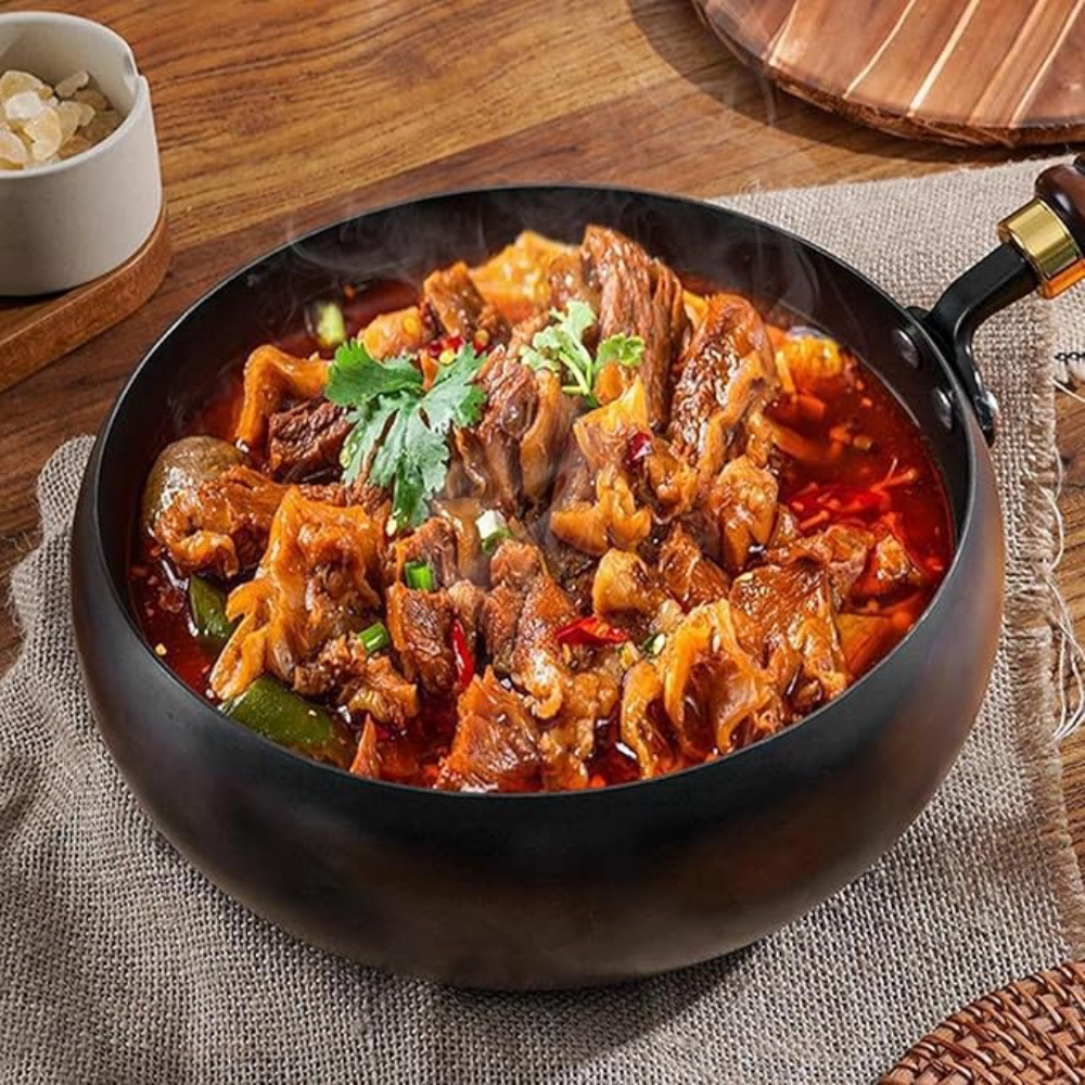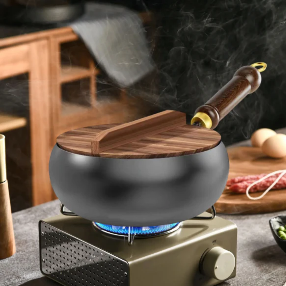Poêle wok noire à bords hauts, conçue pour saisir et mijoter au quotidien. Sa poignée en bois offre une prise en main confortable, tandis que le couvercle en verre permet de surveiller la cuisson sans perdre la chaleur. Format profond pratique pour les plats sautés, sauces et cuissons familiales.