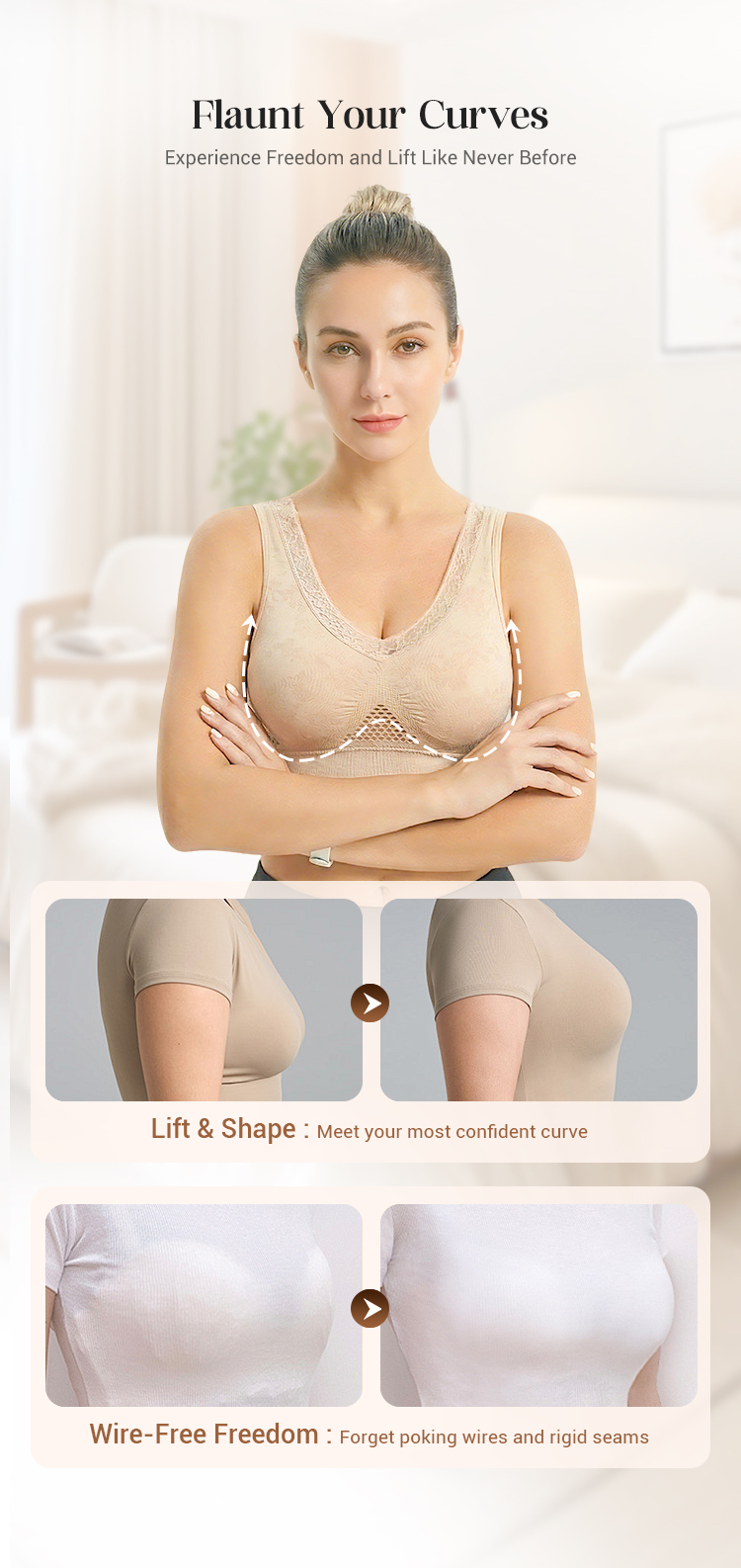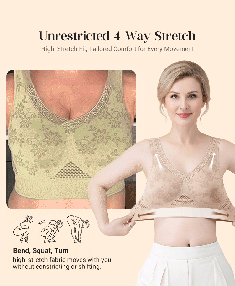 - Maintien renforcé sans armatures : soutien confortable qui aide à garder la poitrine bien en place, sans sensation de tige qui pique.
