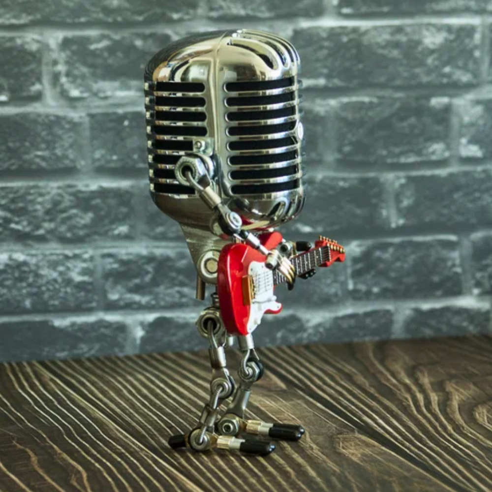 Statuette décorative en métal représentant un microphone vintage stylisé en petit musicien, tenant une guitare. Sa finition argentée avec détails dorés et son look industriel en font un objet original à poser sur une étagère, un bureau ou dans un studio pour apporter une touche musicale à votre intérieur.