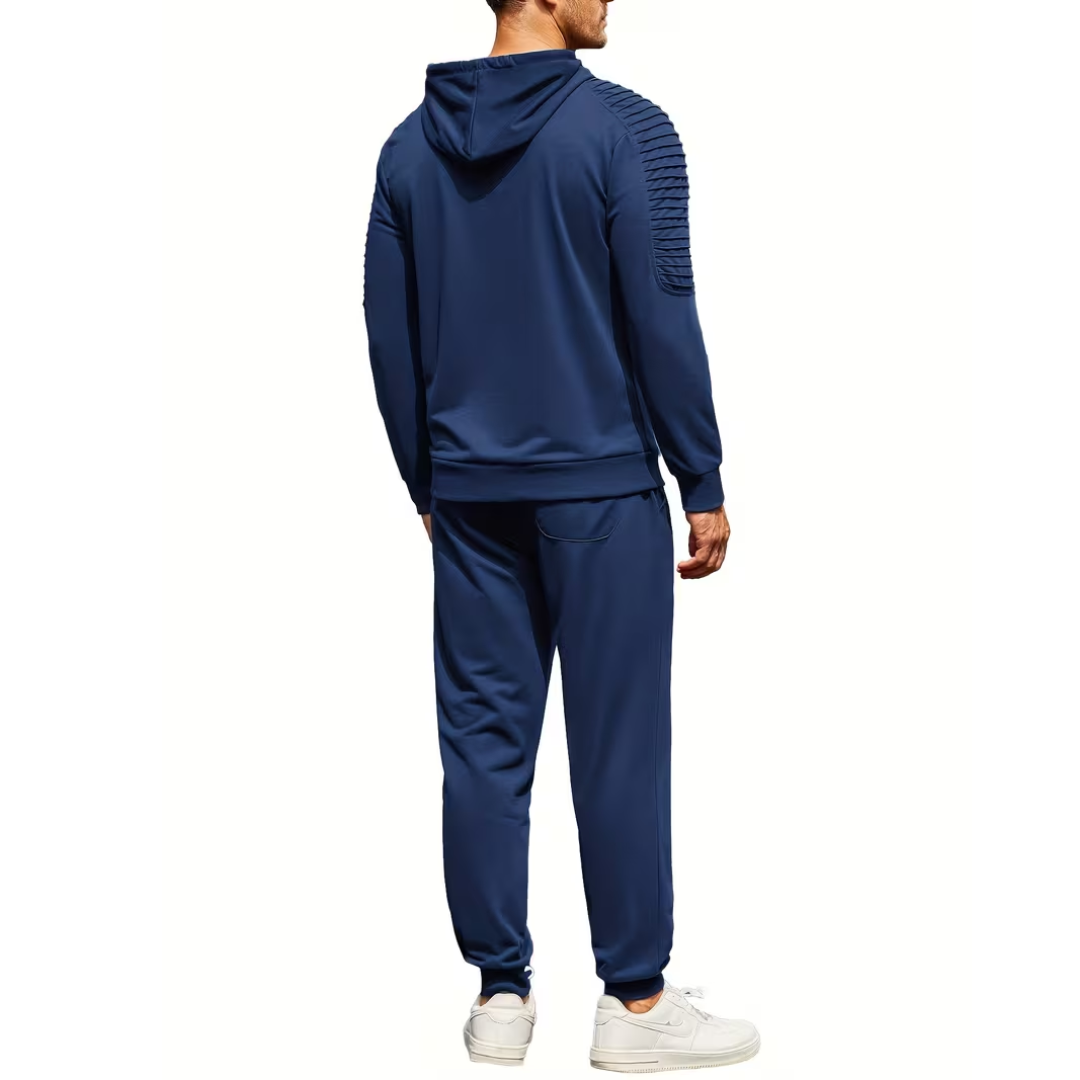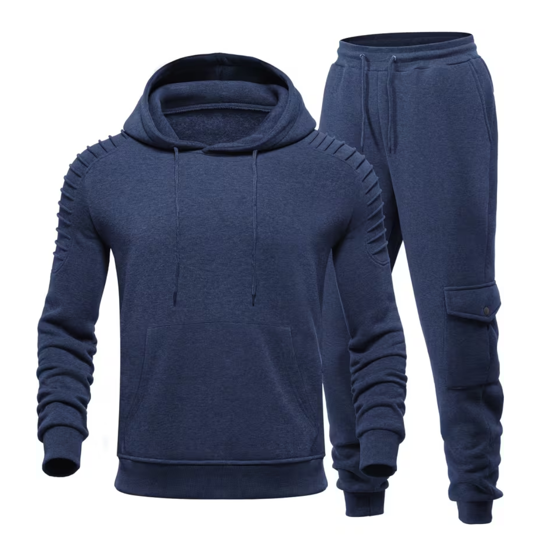 Ce survêtement jogging pour homme est conçu pour un usage polyvalent entre sport, détente et quotidien. Le sweat à capuche offre une coupe ajustée avec finitions structurées sur les manches, tandis que le pantalon assorti dispose d’une taille élastique pour un maintien confortable. L’ensemble présente une allure sobre et fonctionnelle, adaptée à toutes les saisons.