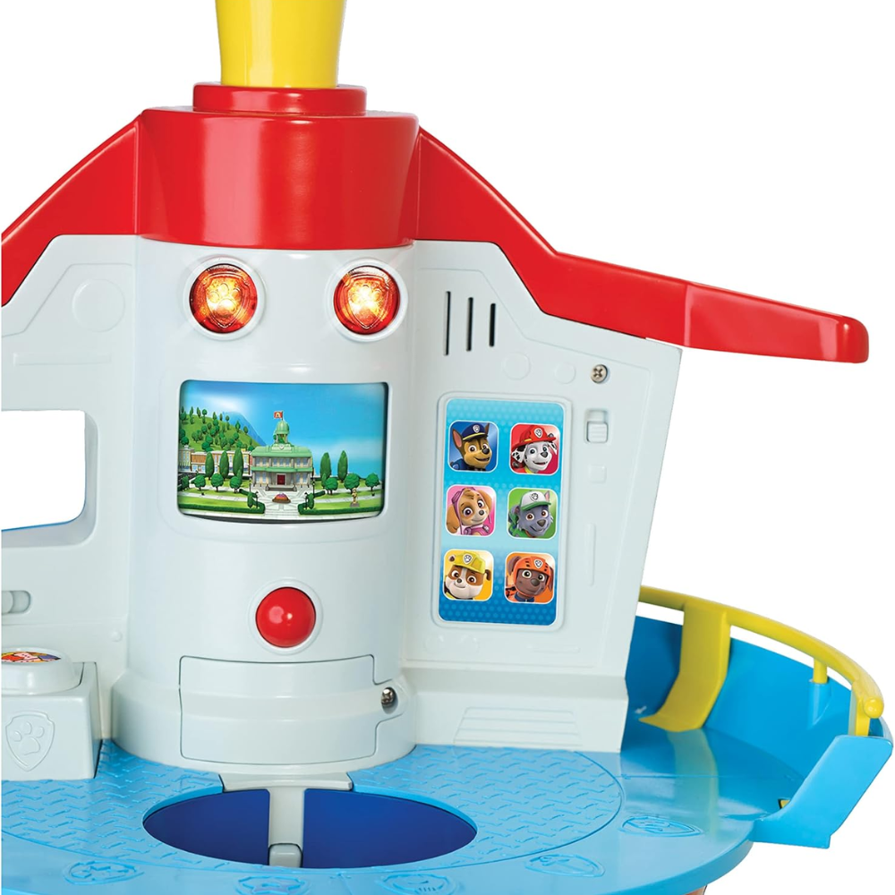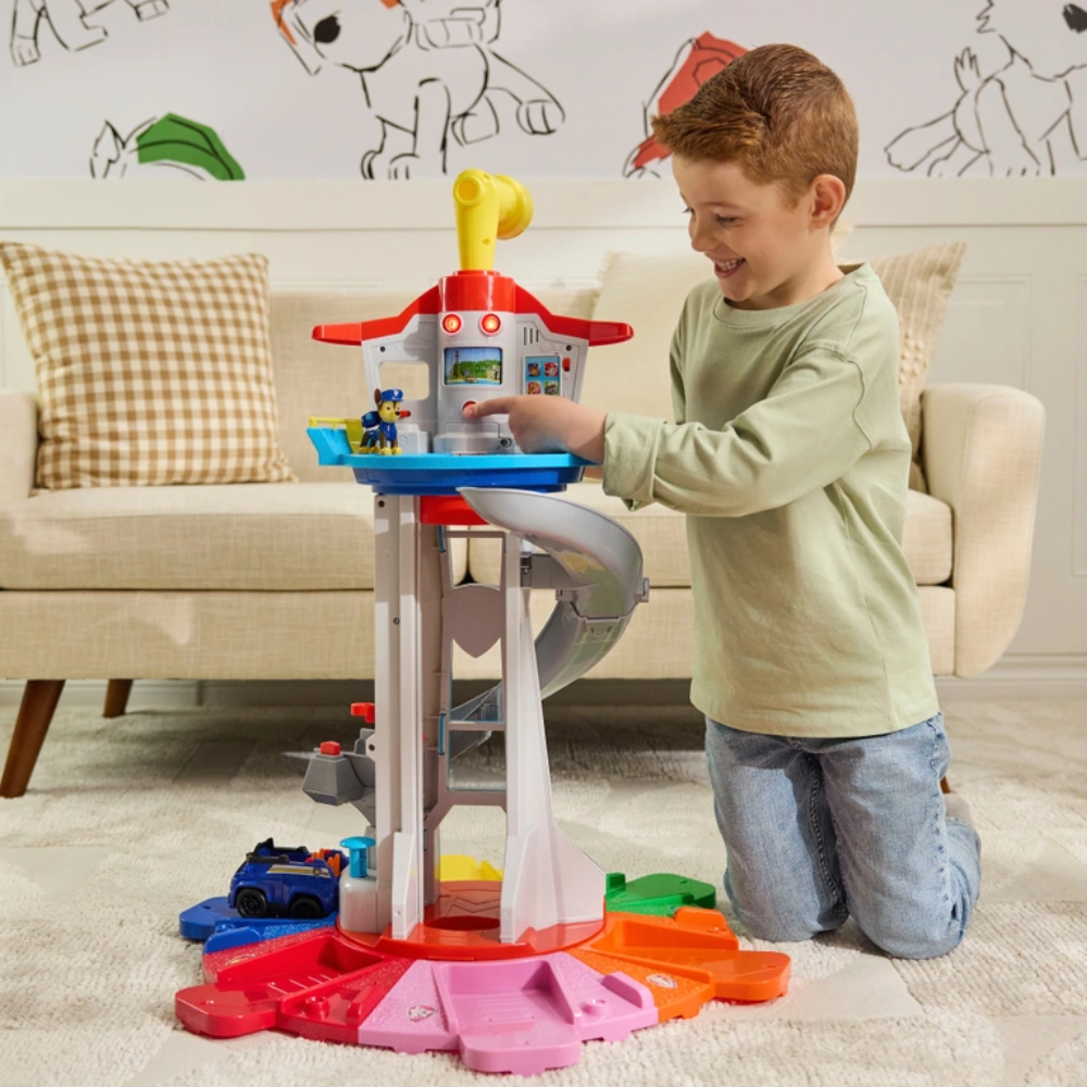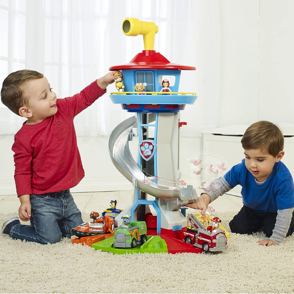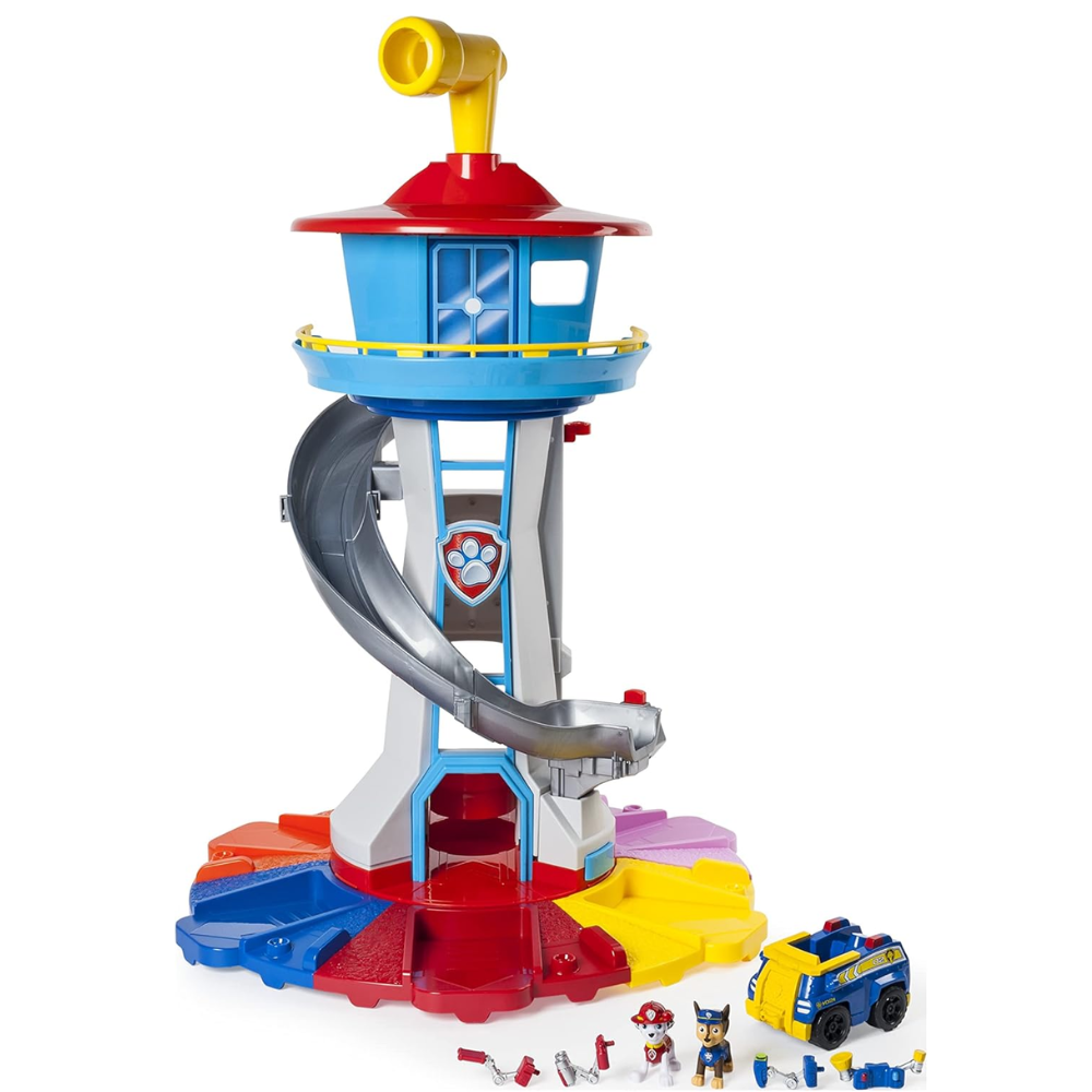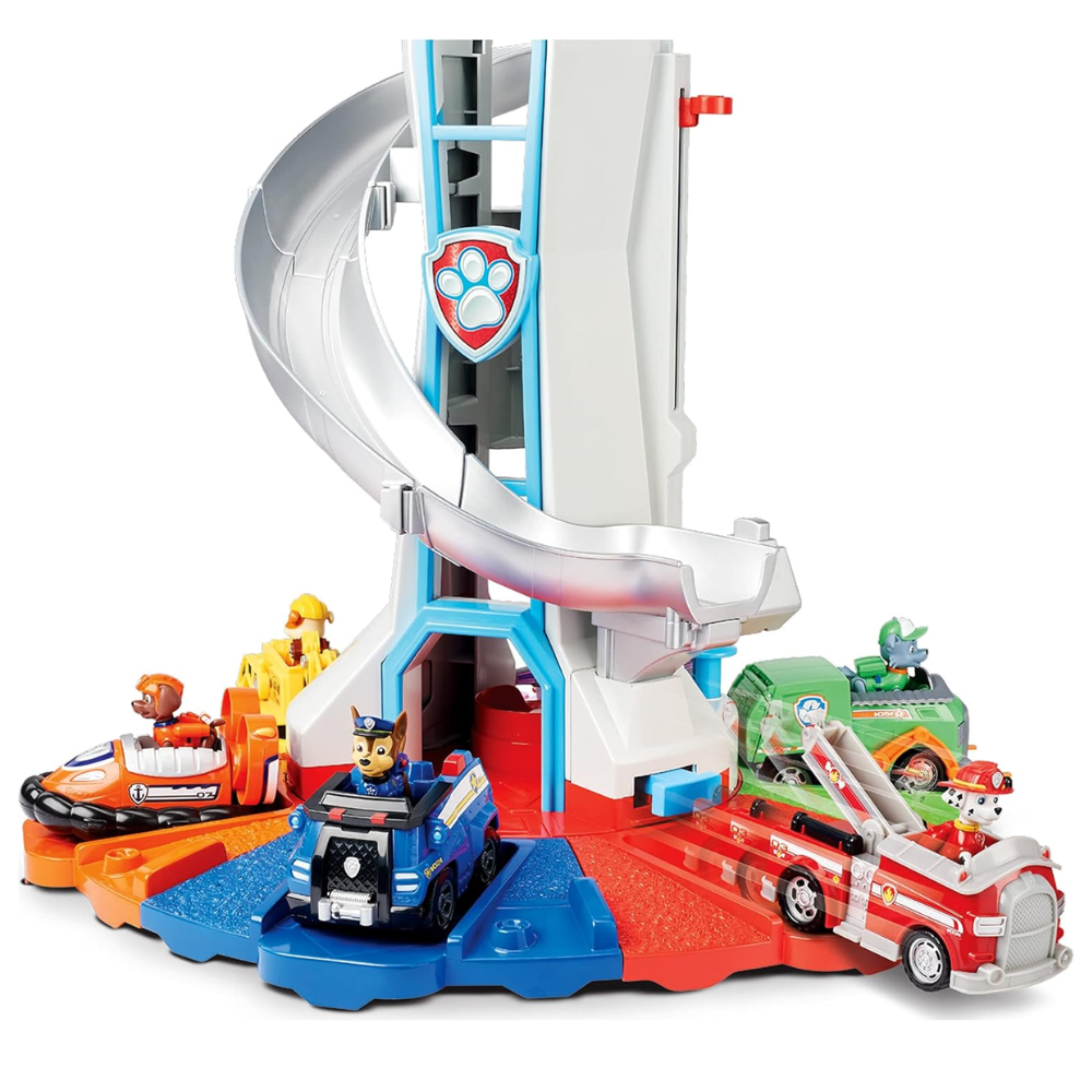Tour de jeu Pat’ Patrouille avec plateforme d’observation, grande rampe spirale et base colorée, accompagnée de plusieurs petits véhicules et figurines de la brigade pour recréer des missions de sauvetage et inventer des histoires à la maison.