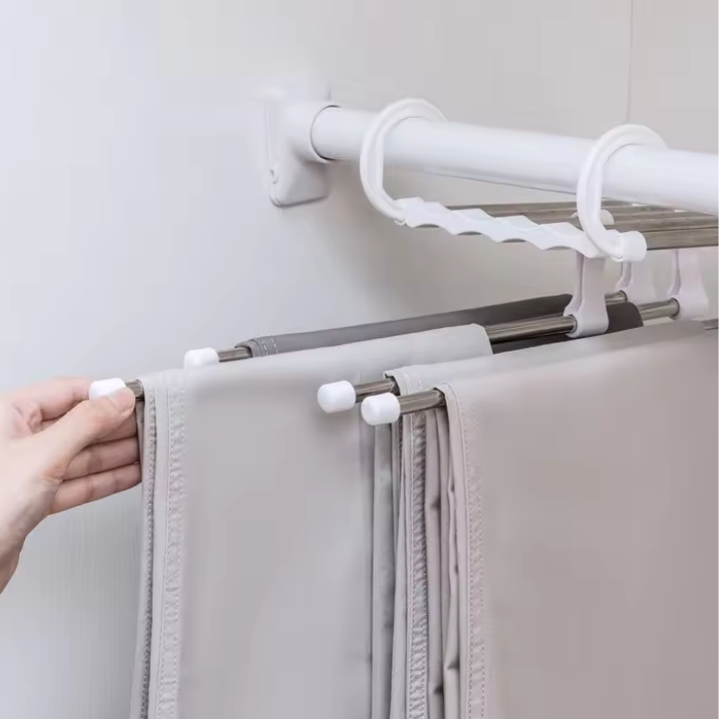 Le WardrobePro 5-in-1 Pants Hanger est conçu pour optimiser chaque centimètre de votre penderie.